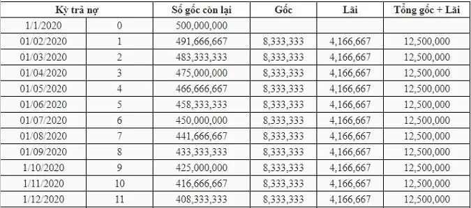 • Tiền gốc: 500 triệu : 120 tháng = 4.166.667